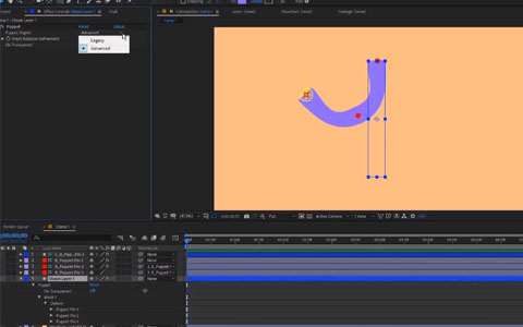 问题出来了,当我们移动骨骼时,会看到整个形状弯曲效果很糟糕。这里有个方法可以让你轻松解决这个问题。我们在之前画好形状图层上选择效果面板,把木偶工具的引擎调整到老版本即legacy选项。然后来到形状图层中的属性里面更改网格数量,我们长期MG动画制作过程中尝试最合适的参数300。然后选择控制器进行拖到,你会看到整个动画变的流畅了。大家要知道网格数字越大人物动作越流畅,但是电脑的运算速度会变慢。小伙伴们在制作MG动画时根据自己的电脑配置设置就好了。以上就是我们在制作MG动画时可以让人物绑定更流畅的方法。